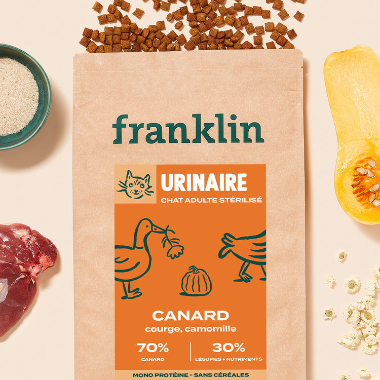 Les croquettes Canard, Courge, Camomille ont été formulées pour convenir aux chats sensibles souffrant de troubles urinaires ou ayant un système urinaire fragile. Cette recette favorise le bien-être et le confort urinaire des chats et contribue à limiter la récidive de cystite et des infections. En effet, elle contient du chlorure de sodium qui s’apparente à du “sel de table”. Plusieurs études ont montré que cet ingrédient augmentait la consommation d’eau de votre félin et favorisait ainsi la bonne dilution de ses urines. La L-Méthionine permet également d'acidifier les urines du chat et ainsi limiter les calculs de struvite. Donner une alimentation adaptée à son chat est un moyen de prévention contre les problèmes urinaires. Attention, ces aliments ne remplaceront pas un traitement contre une maladie de la fonction rénale ou une insuffisance rénale. Une prise en charge par un vétérinaire est nécessaire pour lutter contre la maladie.