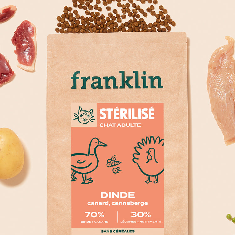 Voilà la recette idéale pour les amateurs de volaille ! Elle contient 70% de dinde et de canard pour faire le bonheur des chats stérilisés qui souhaitent faire attention tout en se faisant plaisir. Préparée avec de la dinde, facile à digérer et peu calorique, du canard, peu allergène et riche en goût, sans oublier la pulpe de betterave pour limiter les boules de poils. Et roule ma poule !