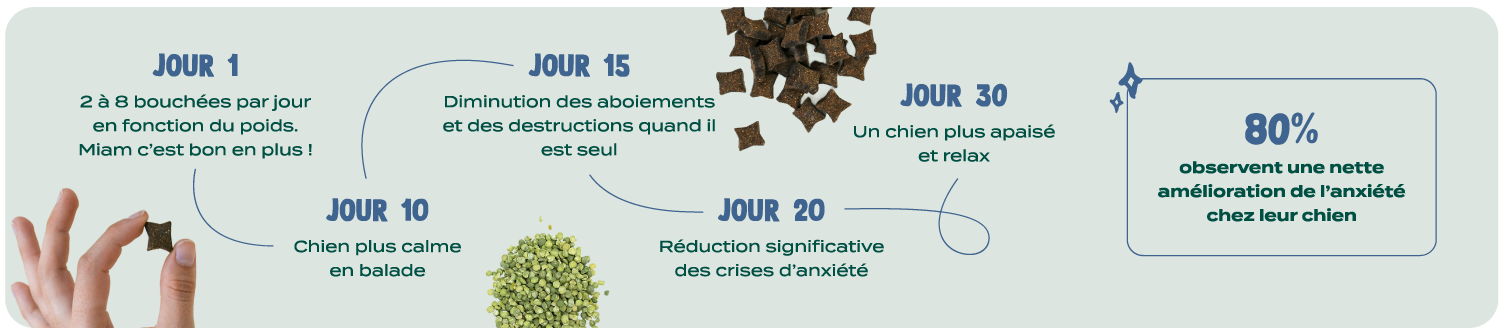 Nous vous recommandons de les utiliser en cure régulière de minimum 1 mois pour gérer un stress chronique ou en prise ponctuelle pour des situations spécifiques comme les voyages ou bruits forts. Cela dépend des besoins du chien et de la fréquence de son stress.
