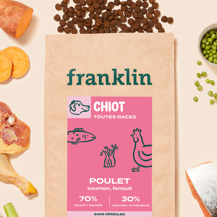 Les chiots ont des besoins nutritionnels bien particuliers pour que leur croissance se déroule convenablement. Il a besoin de trois fois plus d'énergie qu'un adulte ! Des croquettes pour chien adulte ne seraient donc pas assez nutritives pour lui. Afin d'éviter les allergies futures, il est également nécessaire de diversifier les sources de protéines dans leurs croquettes. C’est pourquoi nous avons conçu notre recette chiot avec deux sources de protéines : du poulet et du saumon. De quoi les aider à bien grandir !